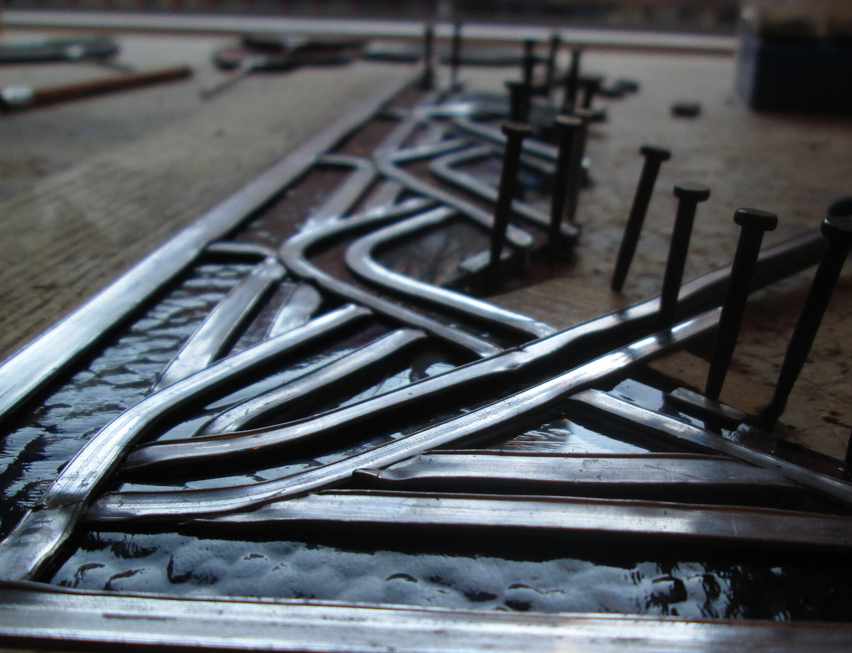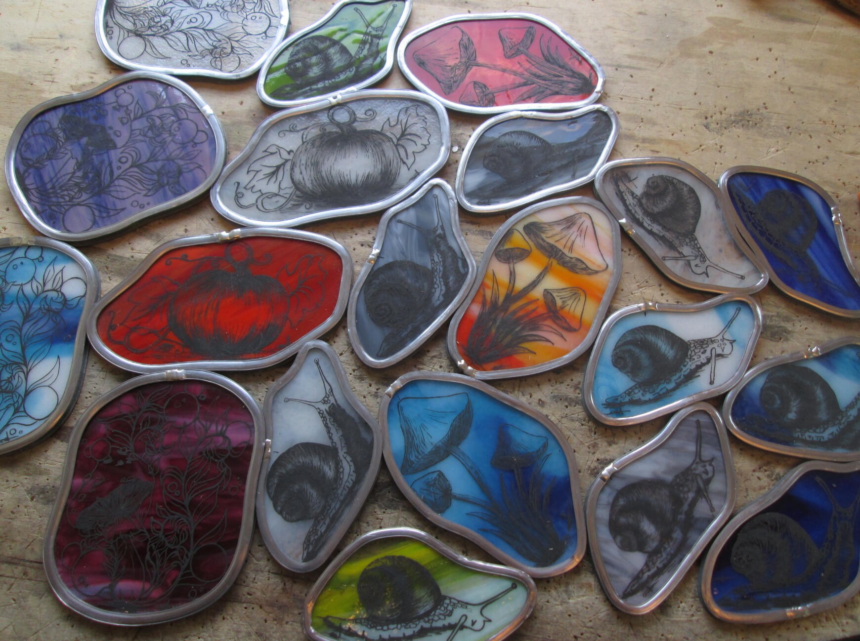 Je propose une série de petites pièces, souvent une pièce de verre coloré, cerclée de plomb et pouvant être suspendue ou plantée.